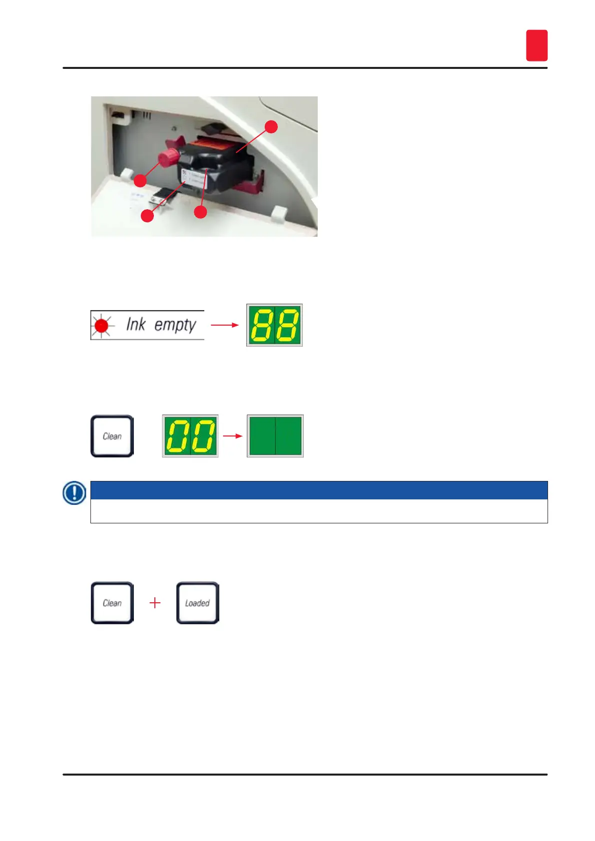 9. The INK EMPTY LED goes out, and 88 appears in the display.