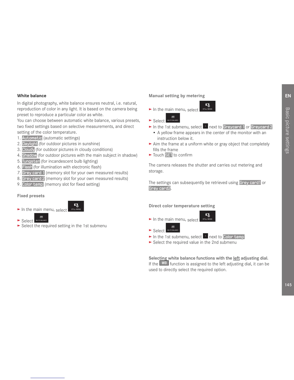 Selecting white balance functions with the left adjusting dial.