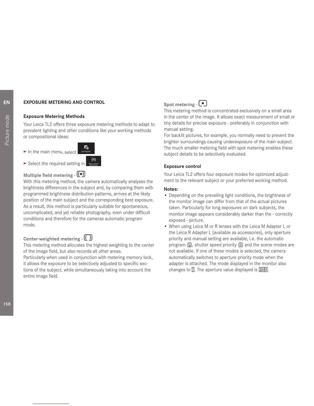 Your Leica TL2 offers three exposure metering methods to adapt to