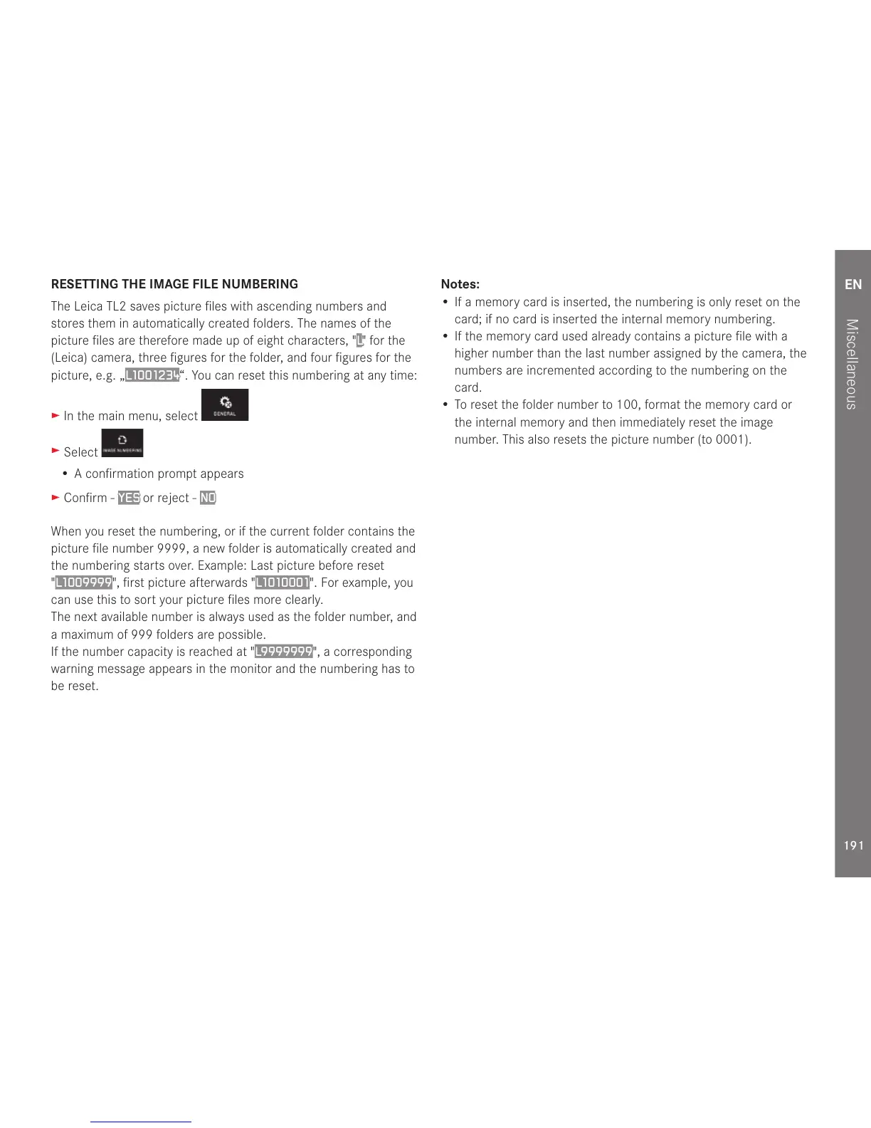 • If a memory card is inserted, the numbering is only reset on the