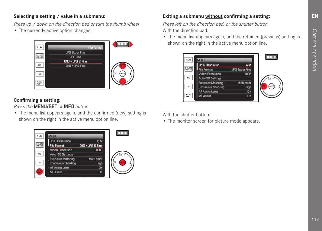 Exiting a submenu without confirming a setting: