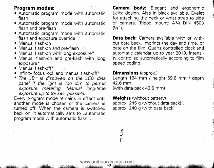 Leica Z2X - Leica Z2 X Program Modes and Specifications; Detailed List of Program Modes; Camera Body, Dimensions, and Weight