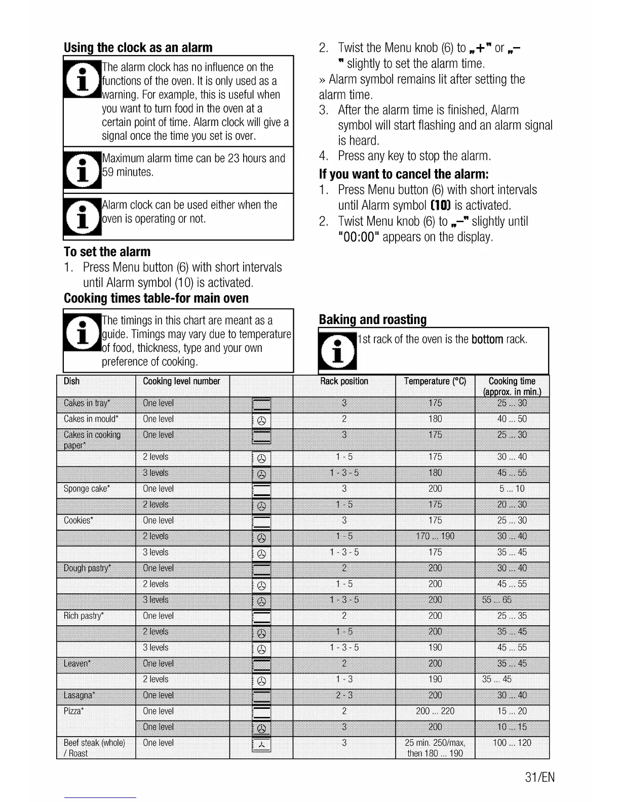 Leisure CuisineMaster CS110F722 - Cooking Times Table - for Main Oven; If You Want to Cancel the Alarm; Baking and Roasting Table