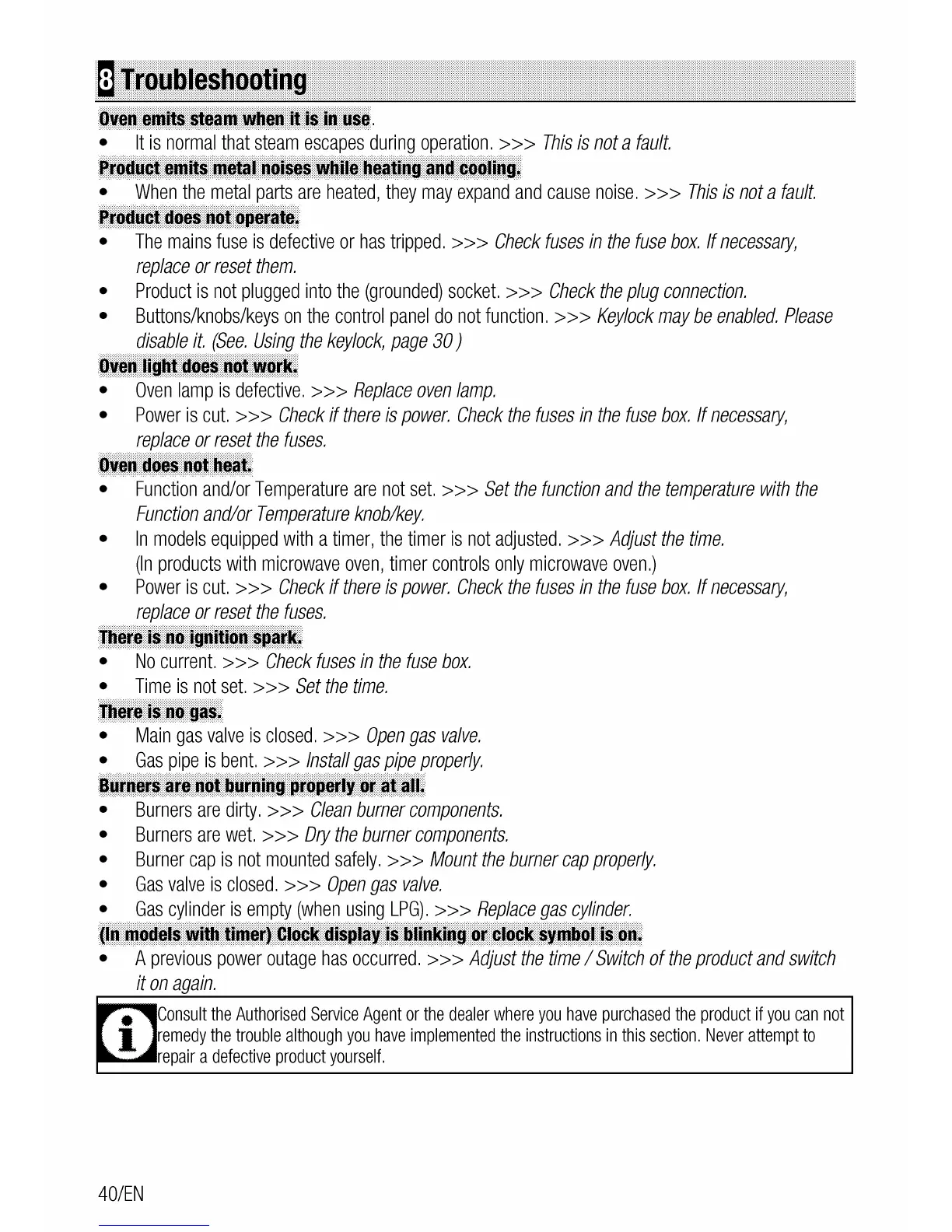 Leisure CuisineMaster CS110F722 - Troubleshooting; Common Oven Operational Issues; Heating, Ignition, and Gas Problems