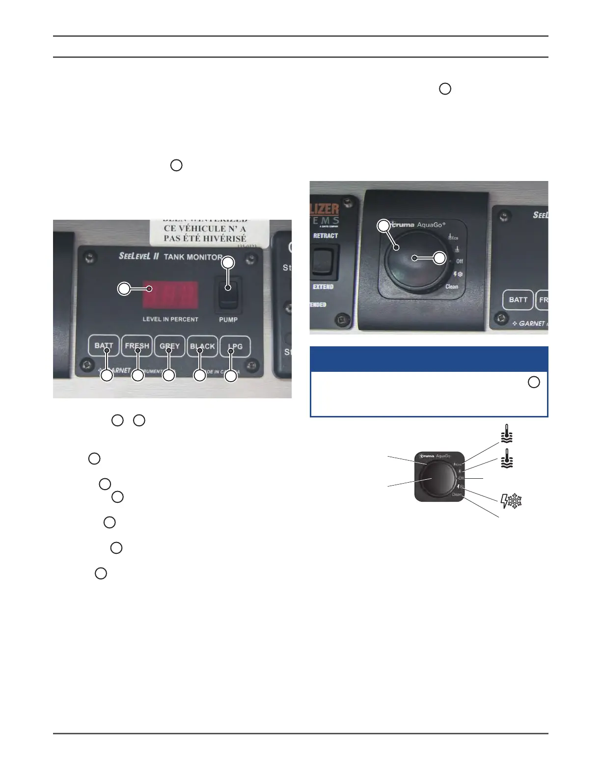 - Displays the grey water holding tank