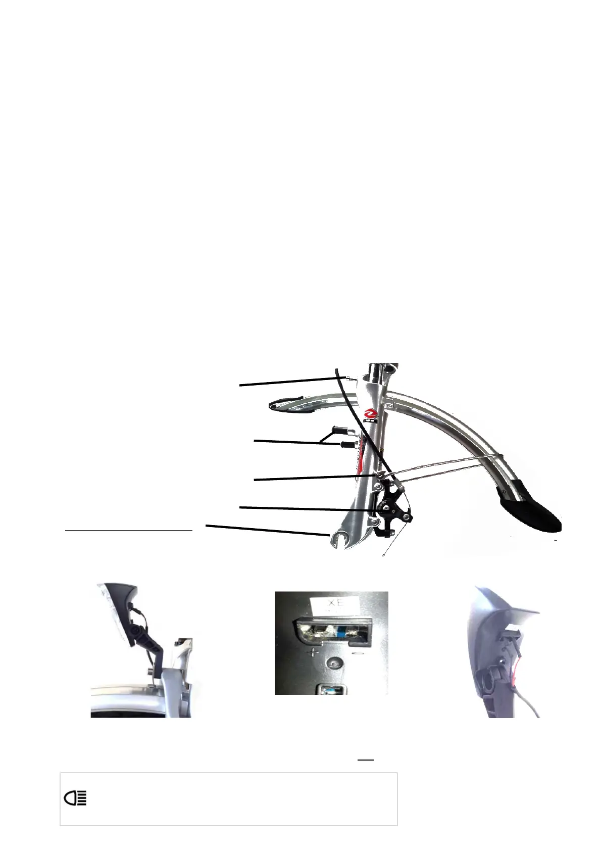 • Locateallparts:battery,keys,frontwheel,mudguards, charger,seatandseatpost,frontlight,handle‐stem,pedals,tools