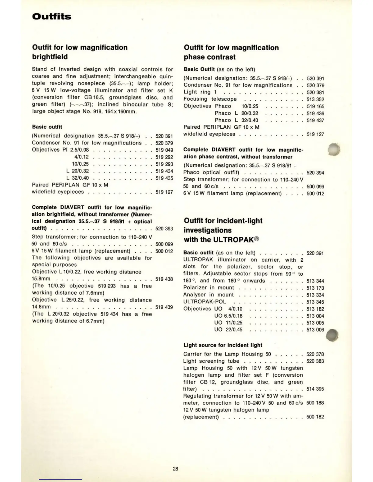 LEITZ Diavert - Outfits; Outfit for Low Magnification Brightfield; Outfit for Low Magnification Phase Contrast; Outfit for Incident-Light Investigations