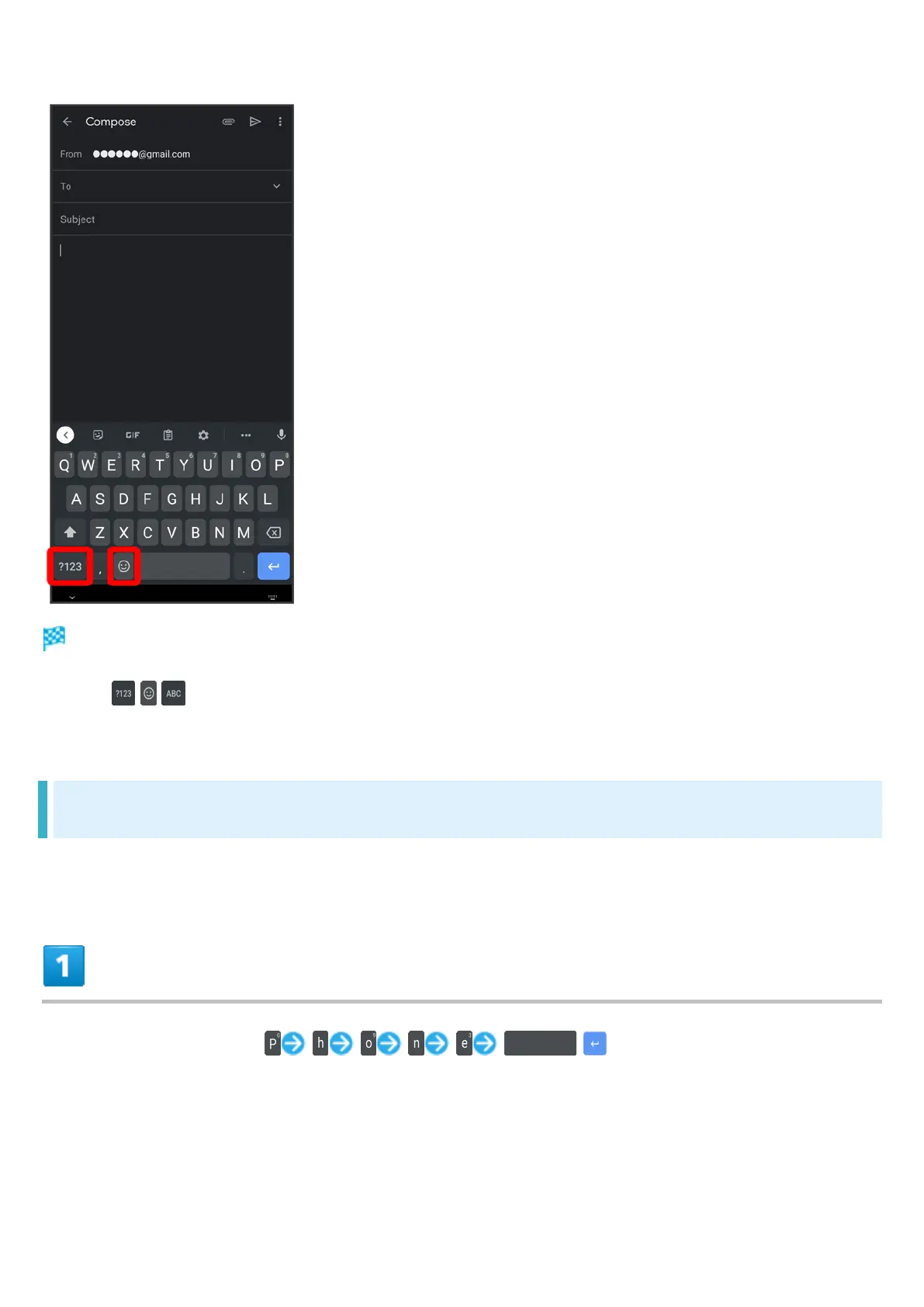 Tap / / to toggle between alphabet entry mode and number/symbol/emoji/emoticon entry