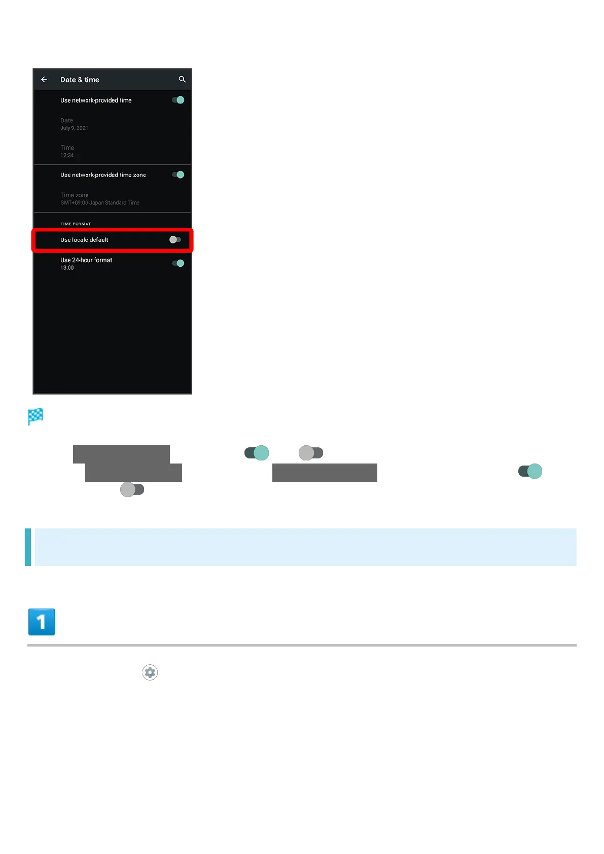 When Use locale default is disabled, Tap Use 24-hour format to toggle 24-hour format ( )/12-