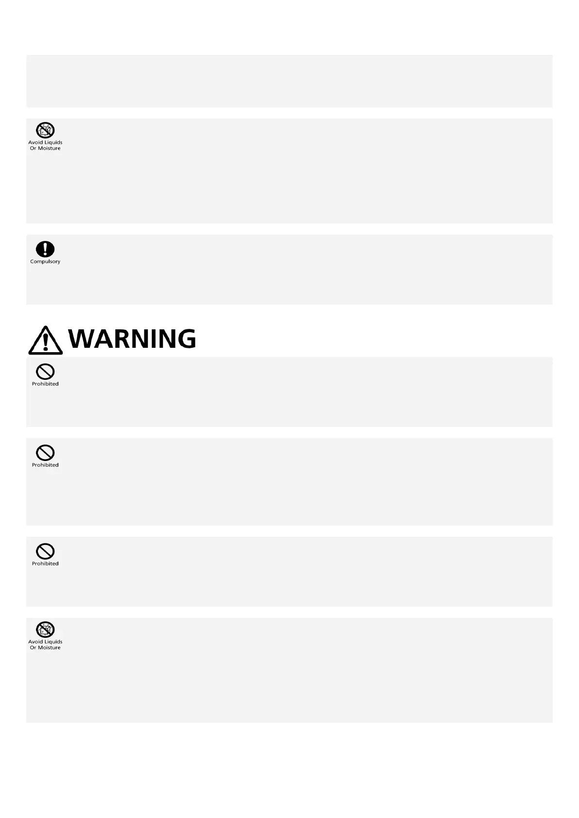 May cause fire, burns, injury, electric shock, etc.