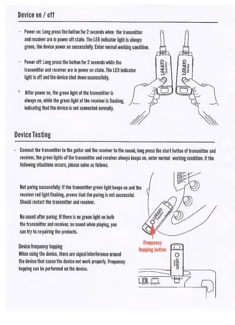 LEKATO WS-70 - Device Operation and Testing; Powering the Device On and Off; Pairing and Testing the System; Frequency Hopping for Interference