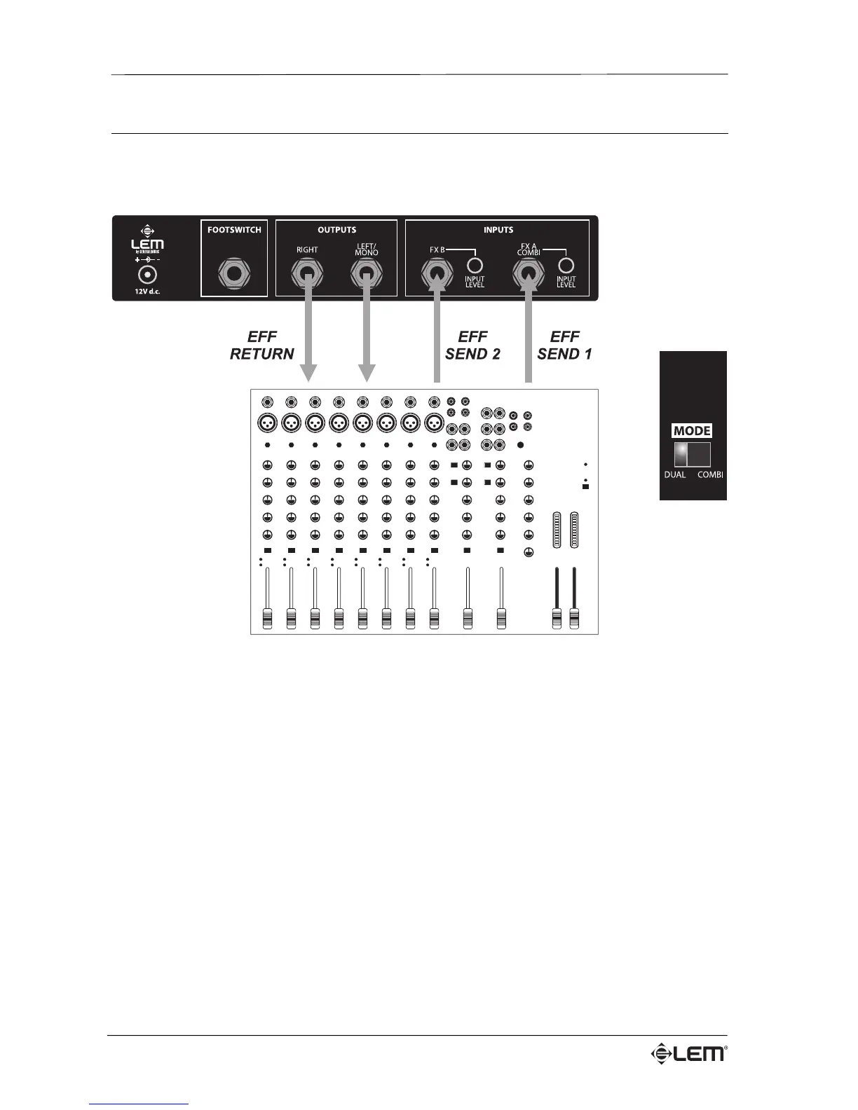 3 -Connect the OUTPUT of the FX 22 to the mixer’s EFF RETURN (or to the amplifier).