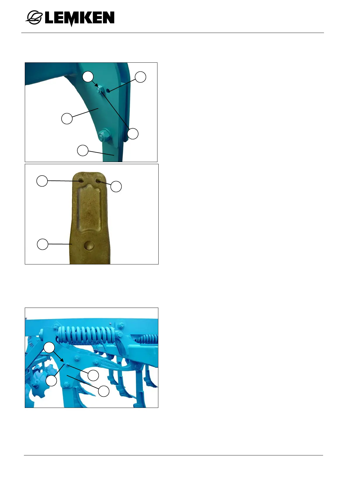Steep share position = insert shear bolt through the bore (6) of the tine pocket (3)