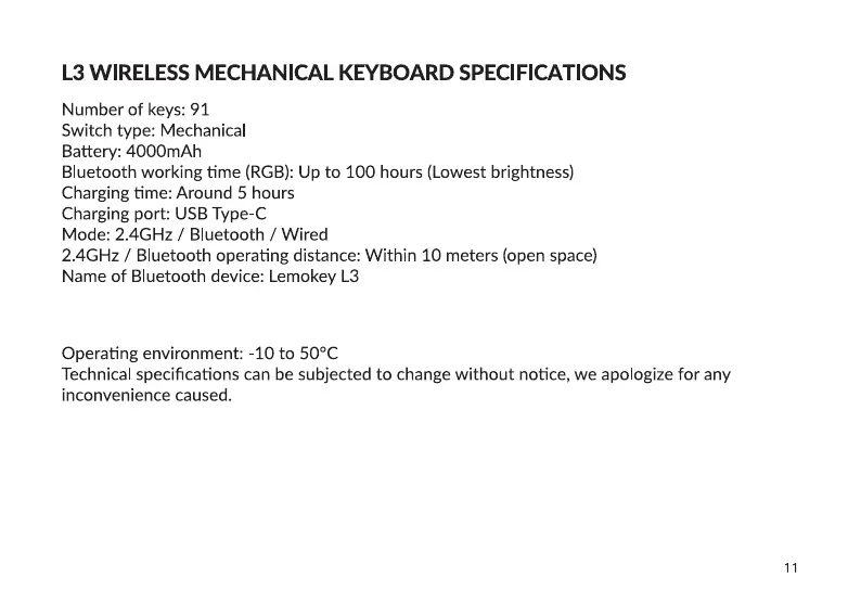 L3 WIRELESS MECHANICAL KEYBOARD SPECIFICATIONS