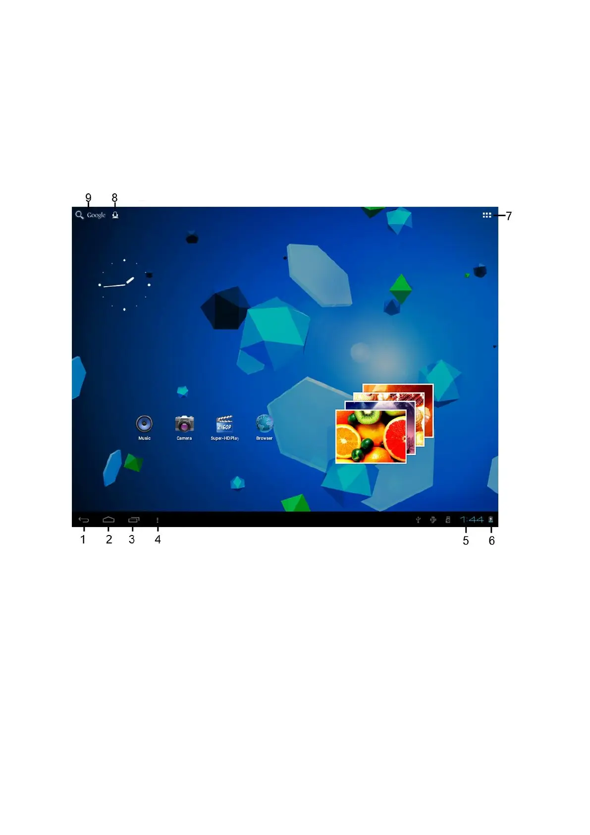 3. Multi-task icon: touch this icon to display all running apps, touch an app to open it.