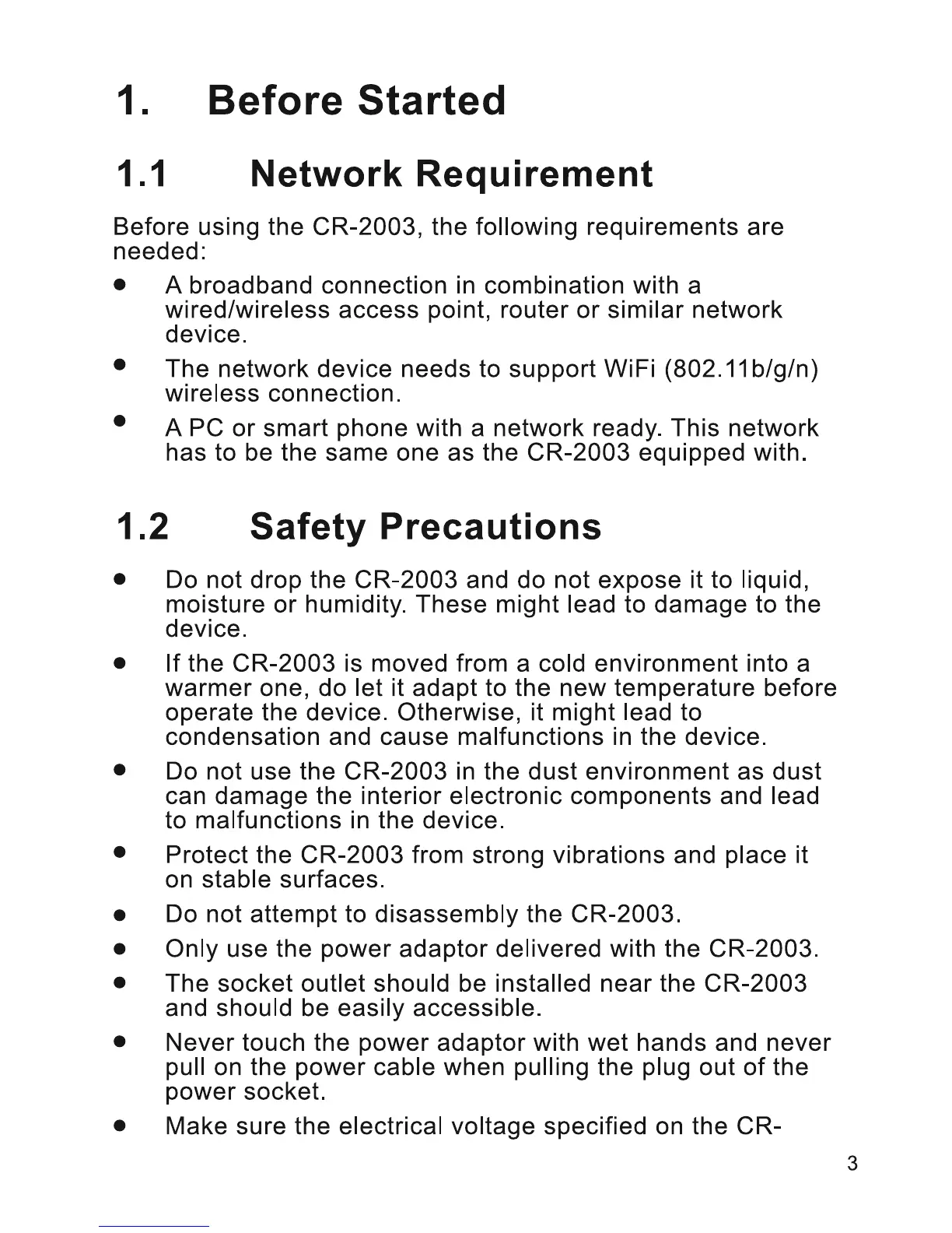 LENCO CR-2003 - Getting Started; Network Requirements; Safety Precautions