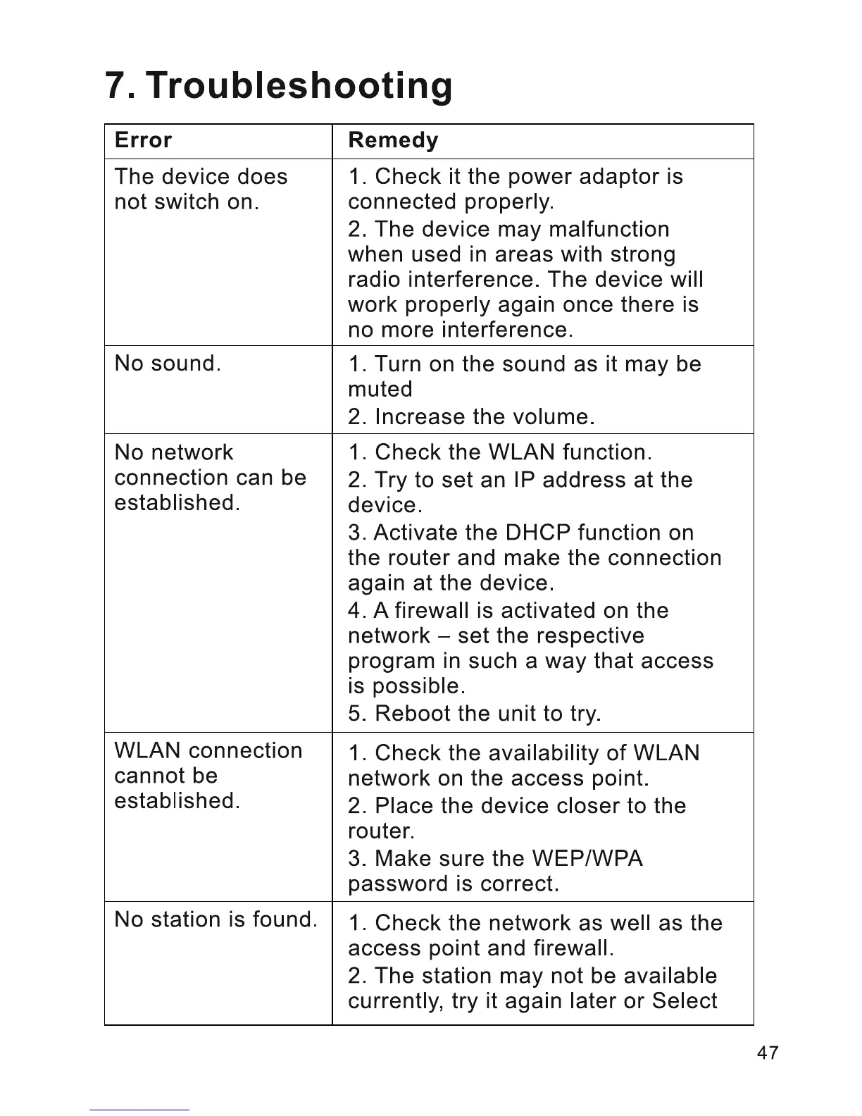 LENCO CR-2003 - Troubleshooting Guide; Device Not Powering On; No Audio Output; Network Connection Issues