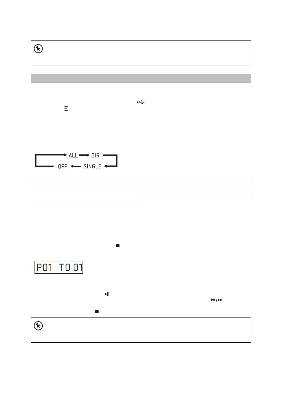 For USB device, ONE and ALL repeat play can be set by repeatedly pressing the REPEAT button