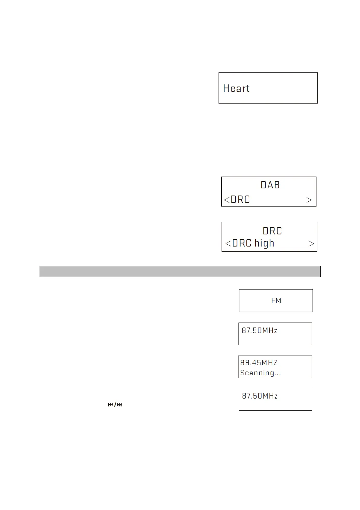 de FM-band, waarbij de huidige frequentie op het scherm wordt