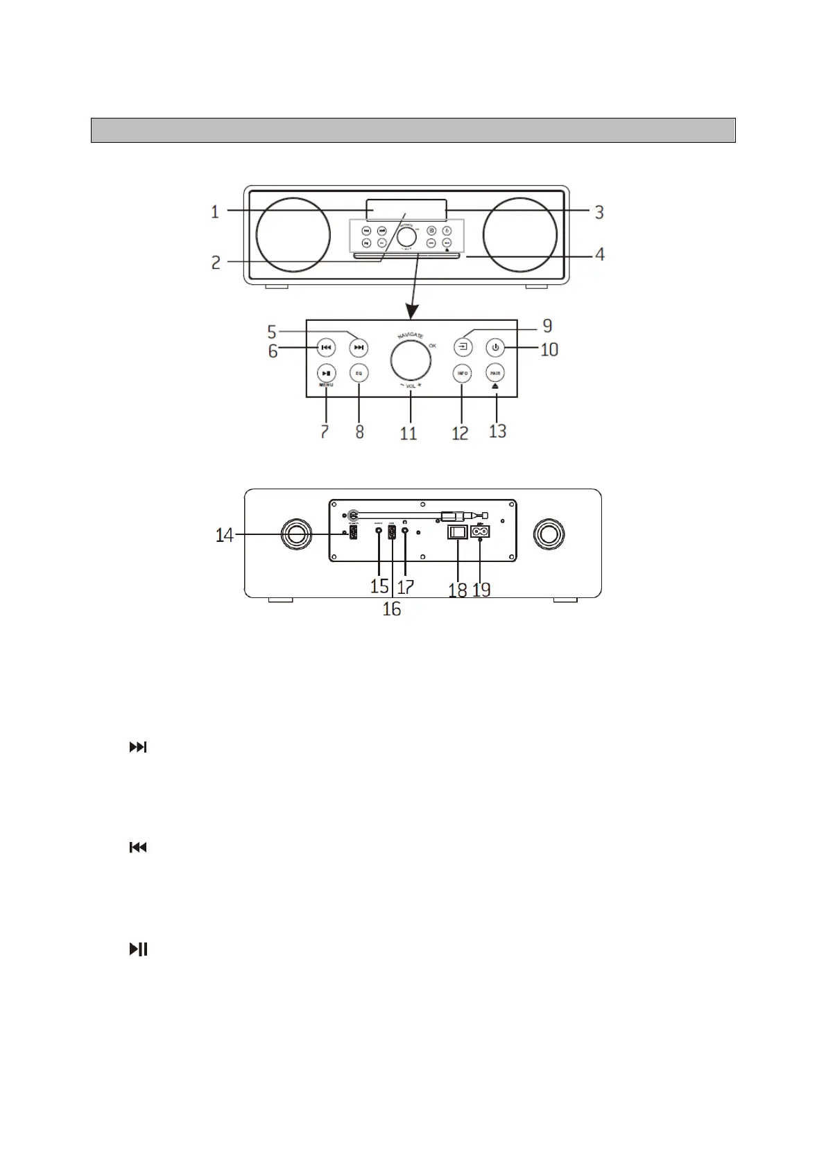 • Drücken Sie die Taste, um die vorhergehende Spur im USB und auf der CD auszuwählen.
