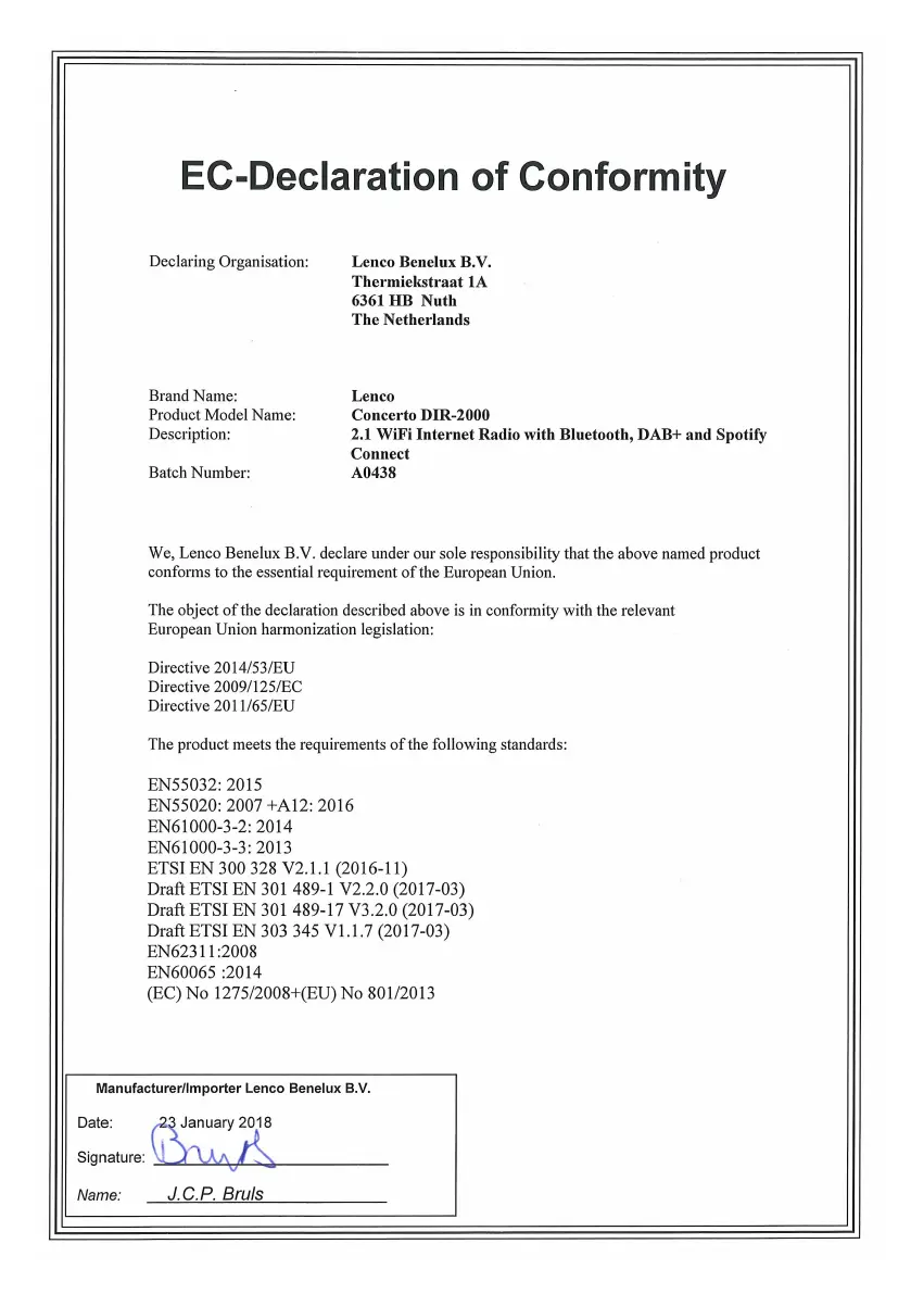 LENCO DIR-2000 - EC Declaration of Conformity; Product Compliance Statement