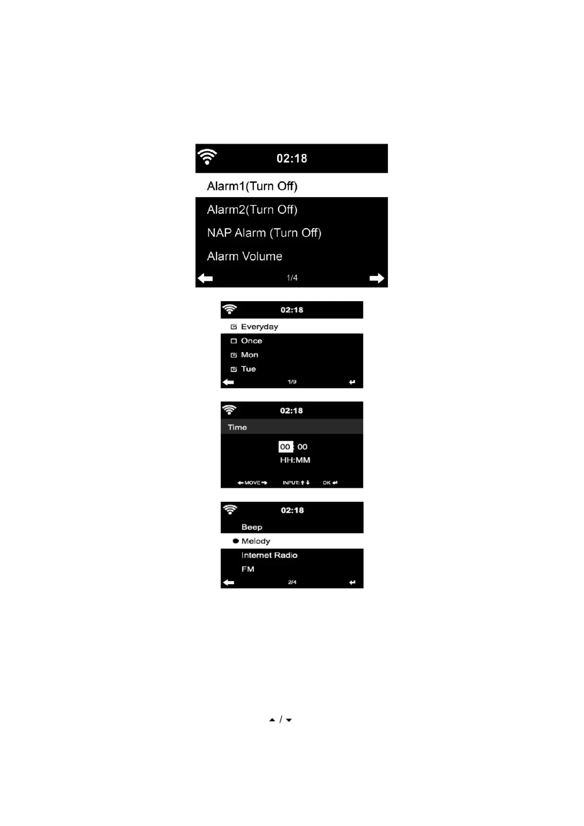 Les deux premières alarmes (Alarme 1 et 2): activez l’alarme 1 ou 2, puis réglez l’heure et