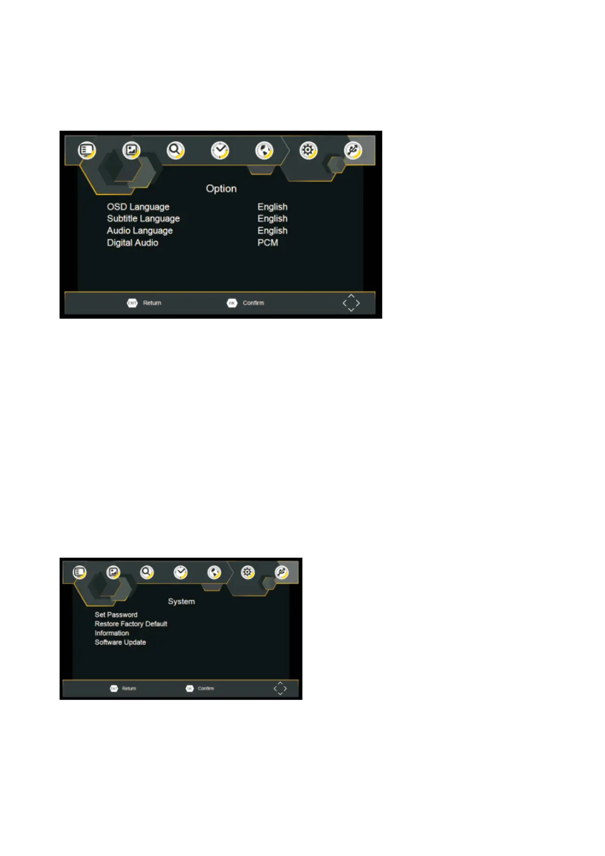 Language, Subtitle Language and Audio Language. Select an option and press RIGHT/LEFT to adjust