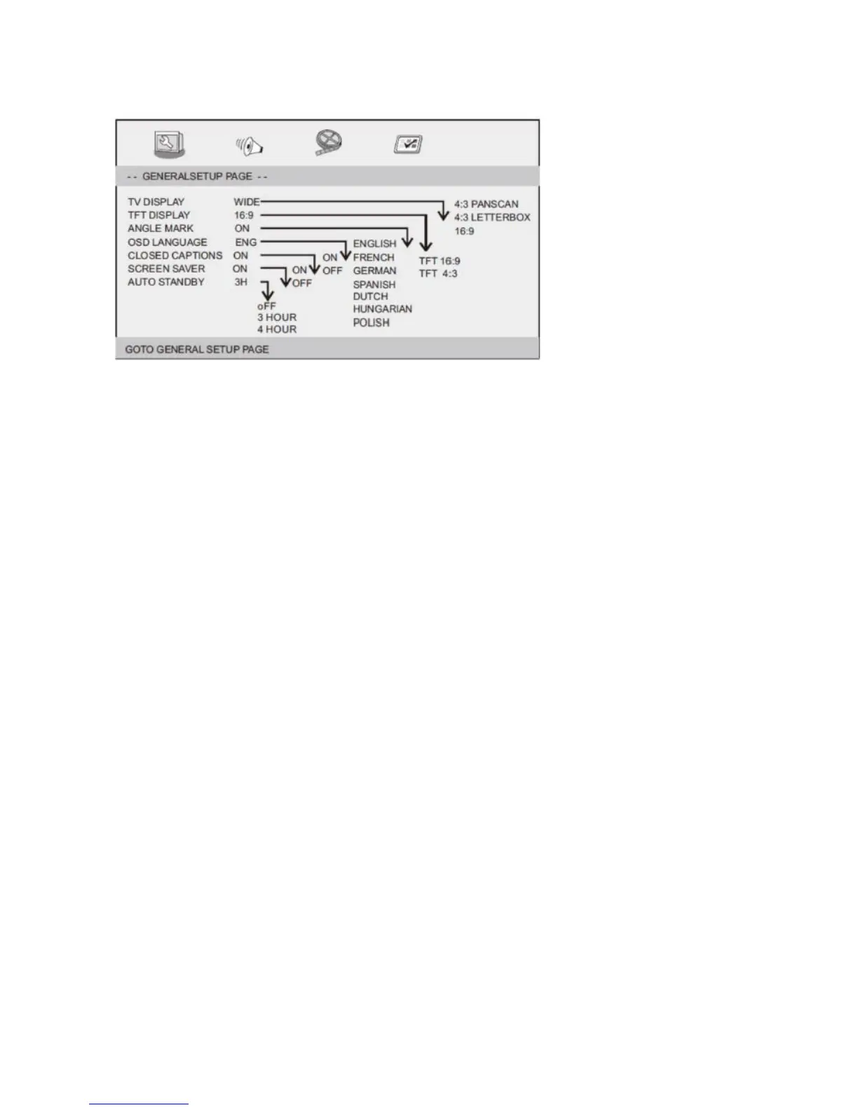 4:3 LETTERBOX: if you have a normal TV. In this case, a wide picture with black bands on the upper and