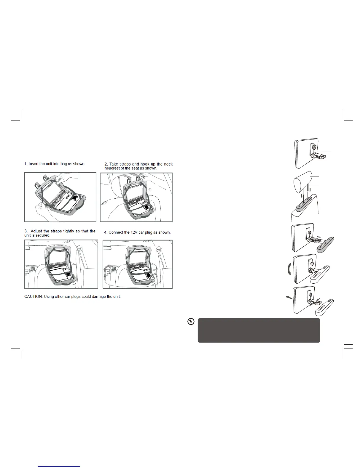 • This unit should never be used by the vehicle’s driver or left unsecured in the vehicle while
