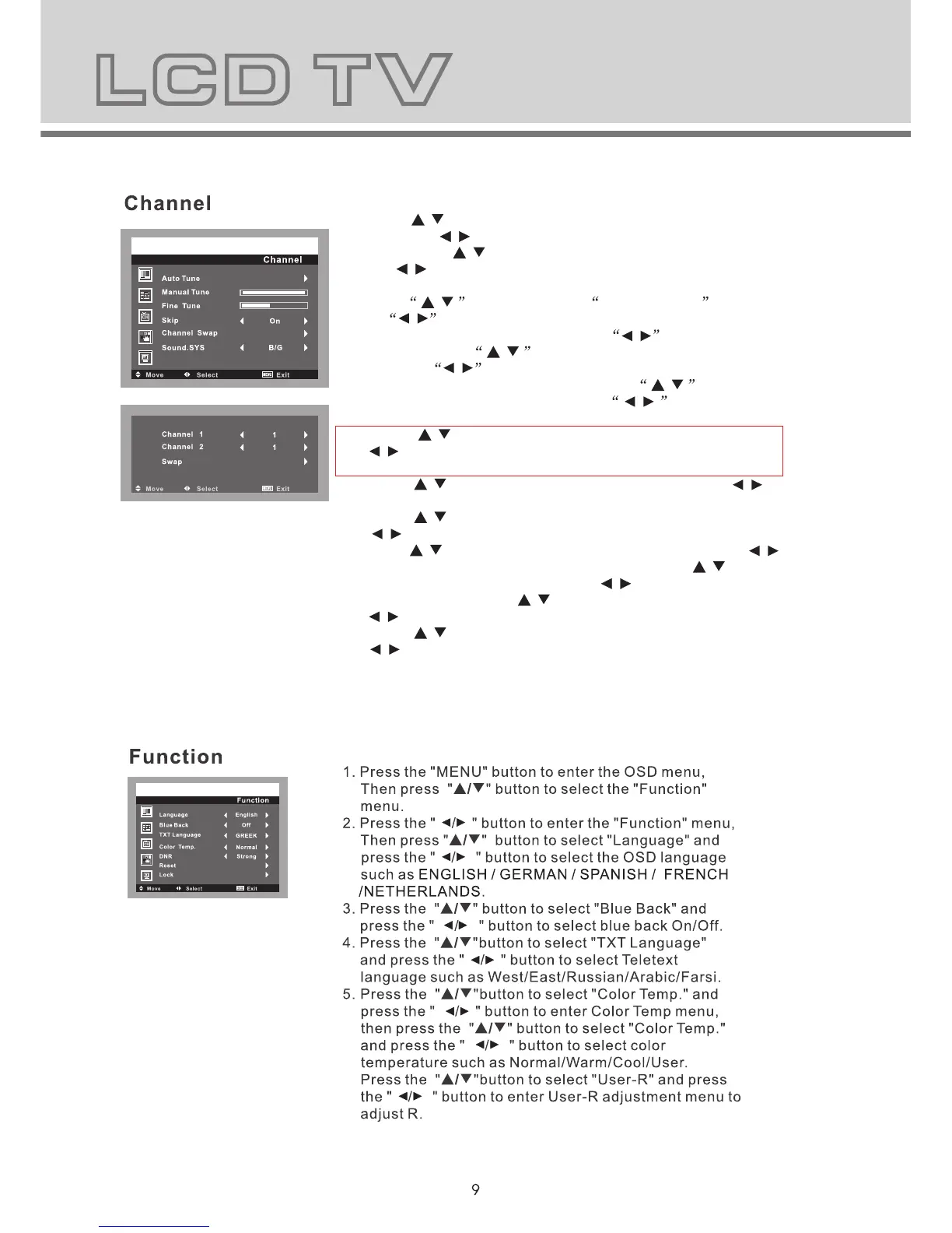 Highlight Channel item, press the / button to change
