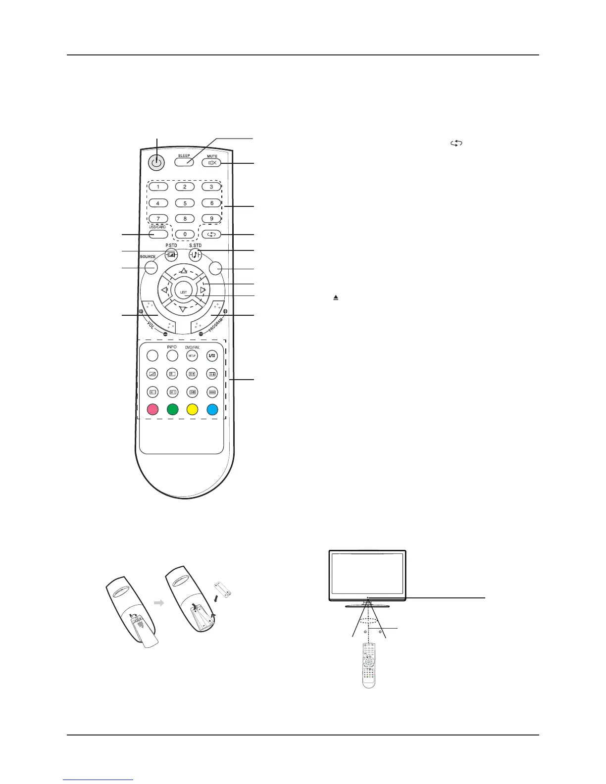 Always remove batteries if the remote control is not to be used for more than a month. Batteries left in it may cause damage.