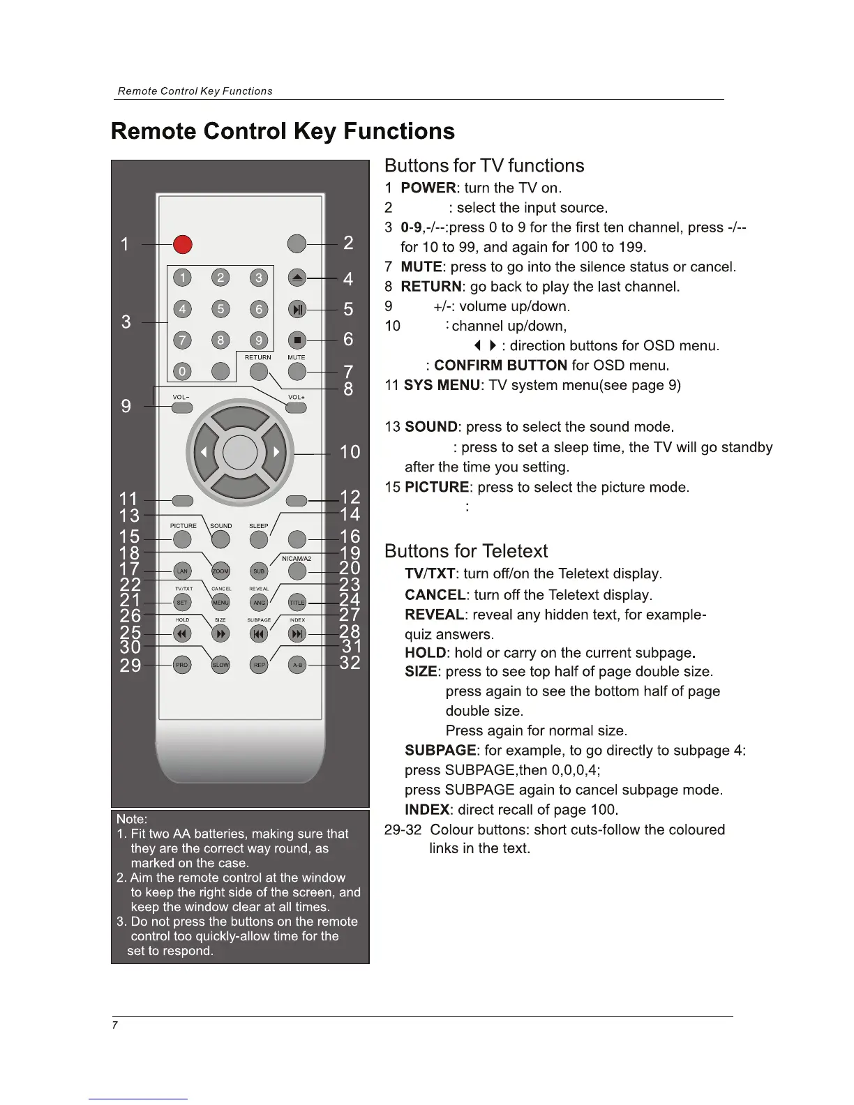 LENCO DVT-2421 - Remote Control Functions; TV Operation Buttons