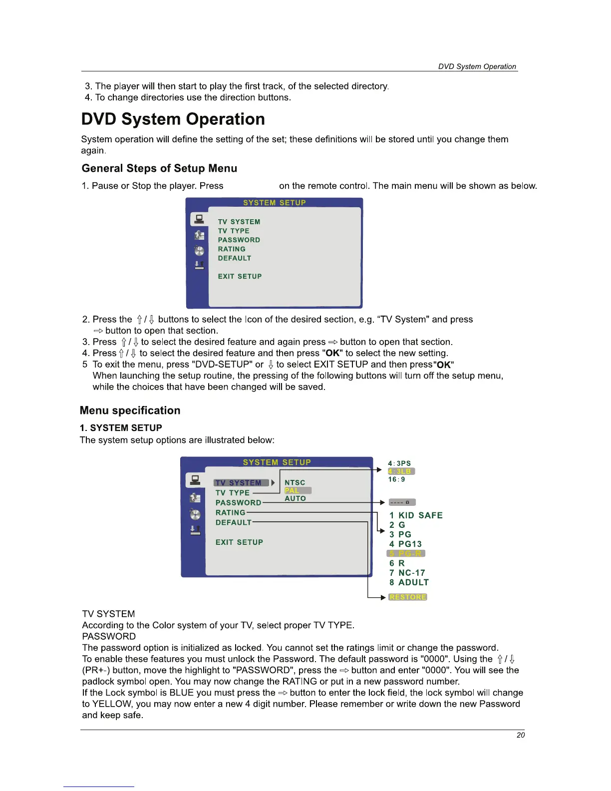 LENCO DVT-2421 - DVD System Operation; Navigating the Setup Menu; System Setup Categories
