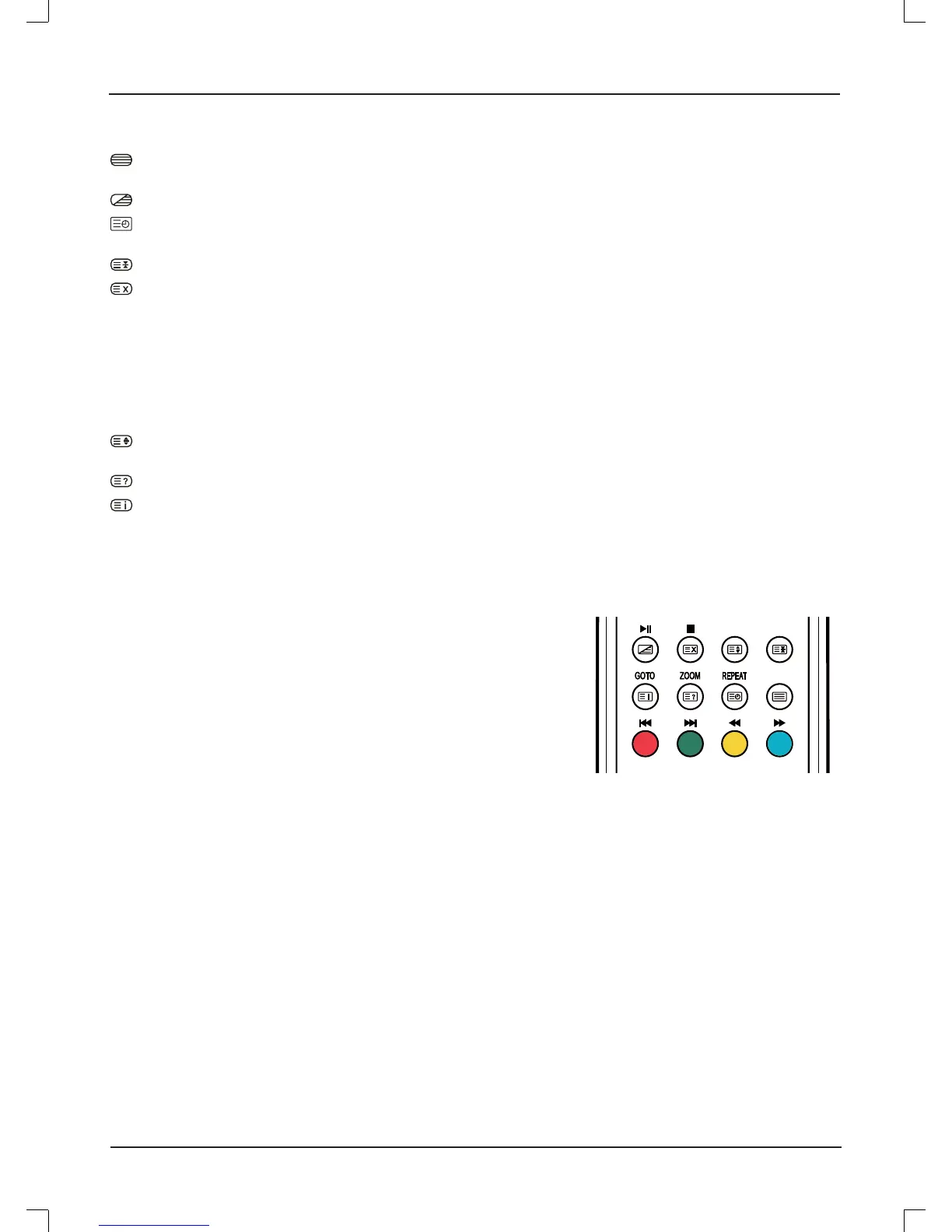 The RED, GREEN, YELLOW & CYAN buttons are used for quick access to color coded pages transmitted by FAST TEXT