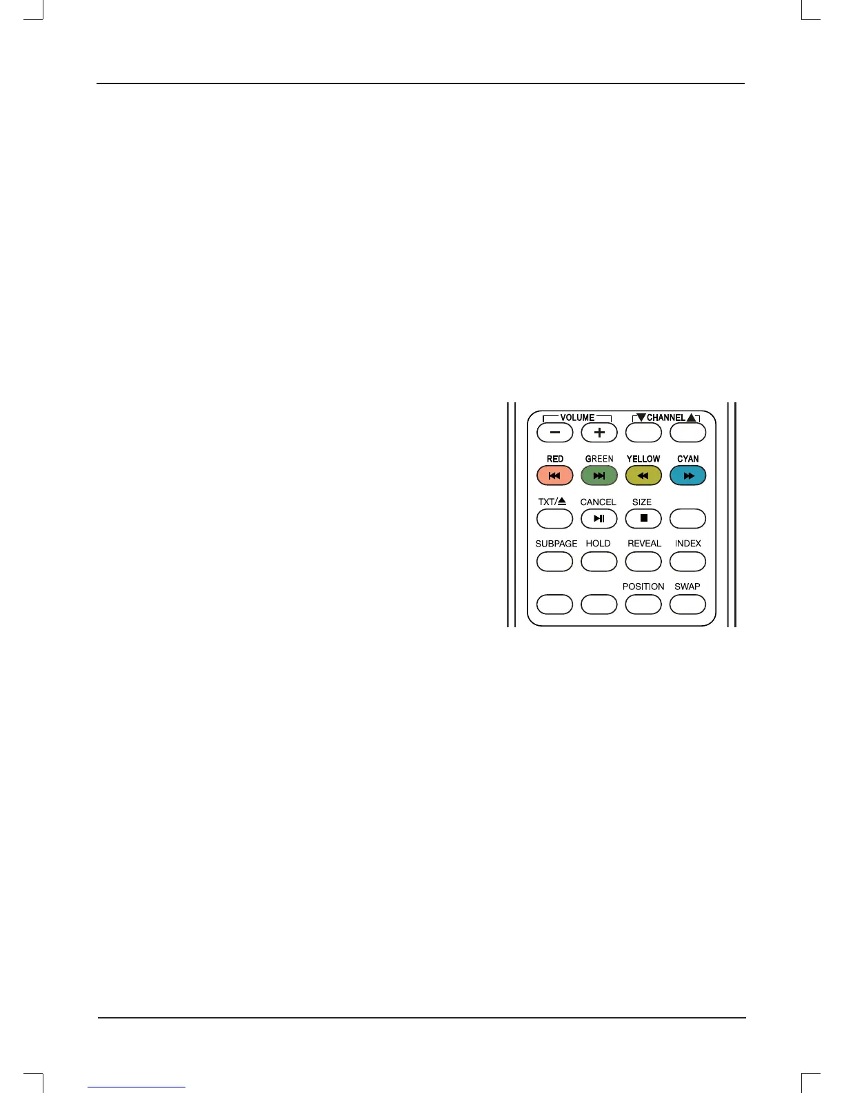 The RED, GREEN, YELLOW & CYAN buttons are used for quick access to color coded pages transmitted by FAST TEXT