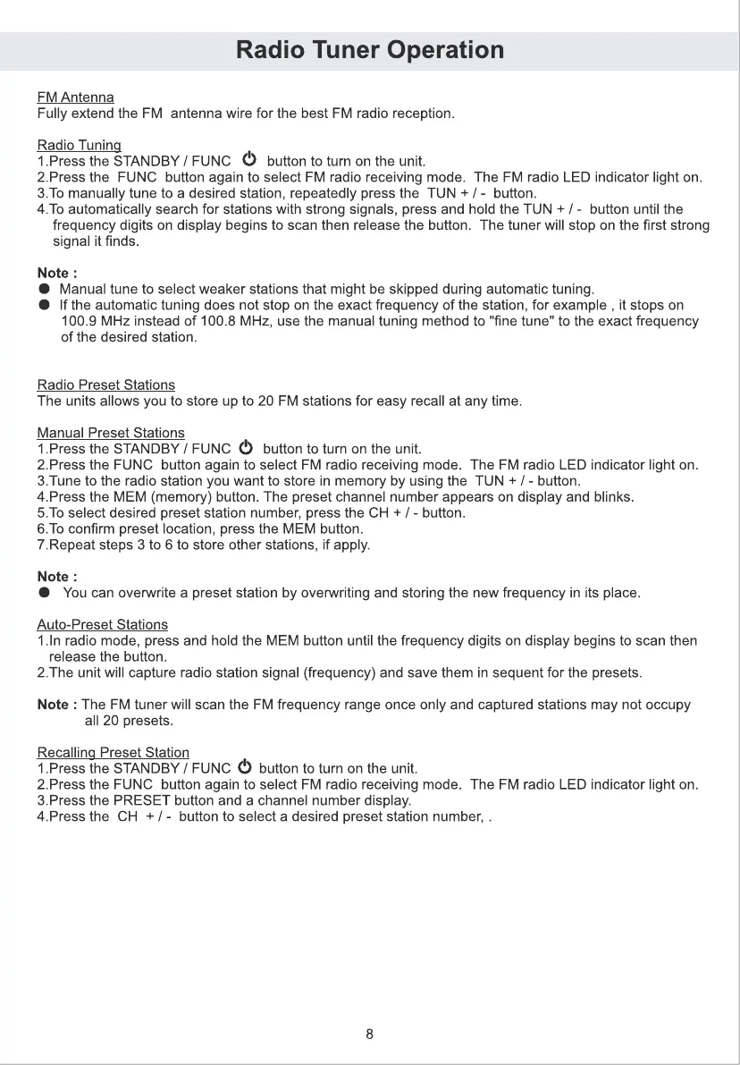 LENCO IPD-4800 - Radio Tuner Operation; Radio Tuning and Reception; FM Preset Station Management