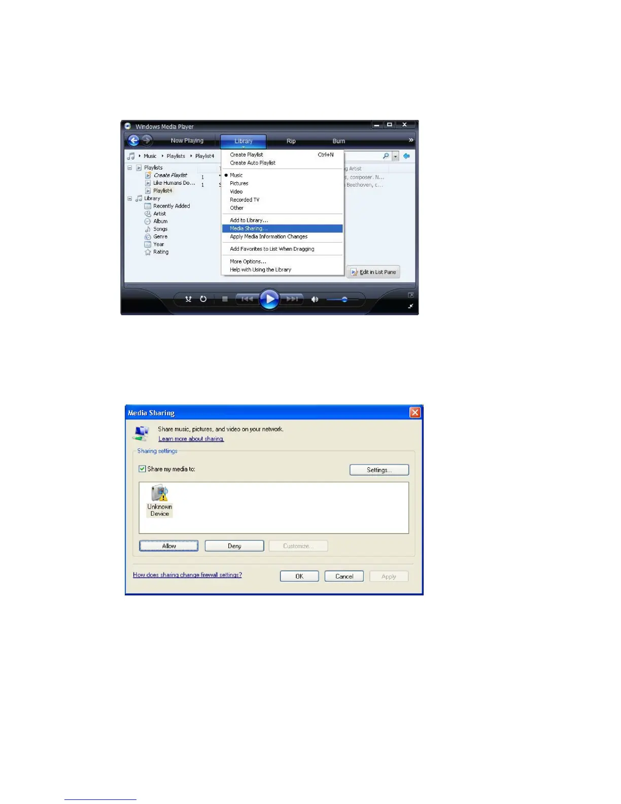 Selecting ‘Media Sharing…’ for Windows Media Player11 :