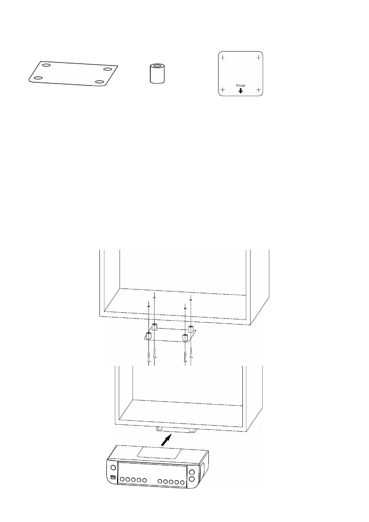 3. Instale la placa de plástico bajo el armario / estantería usando los espaciadores y tornillos que se adjuntan; remítase al diagrama
