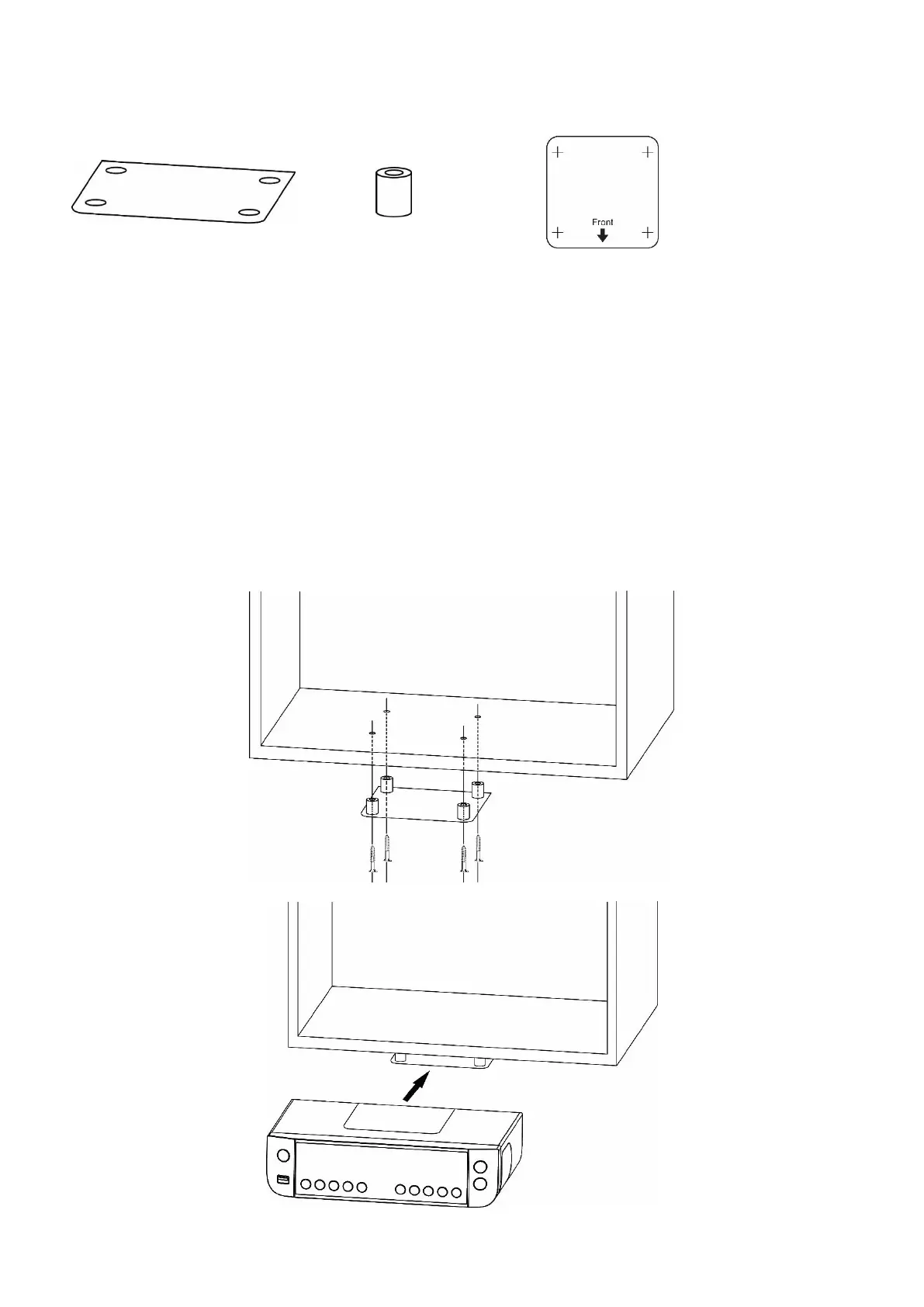 3. Install the plastic plate under the cabinet/shelf using the supplied spacers and screws, refer to the diagram below. Spacers are