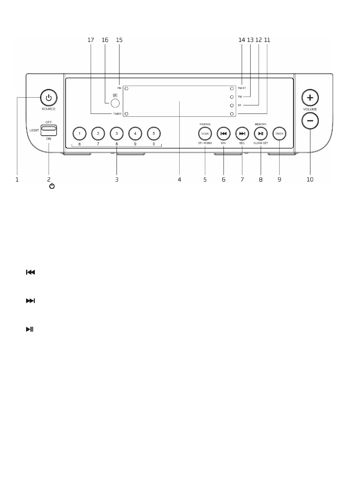 FM: Press to toggle between FM Stereo and Force Mono reception. Press and hold to start the full auto-scanning and store the