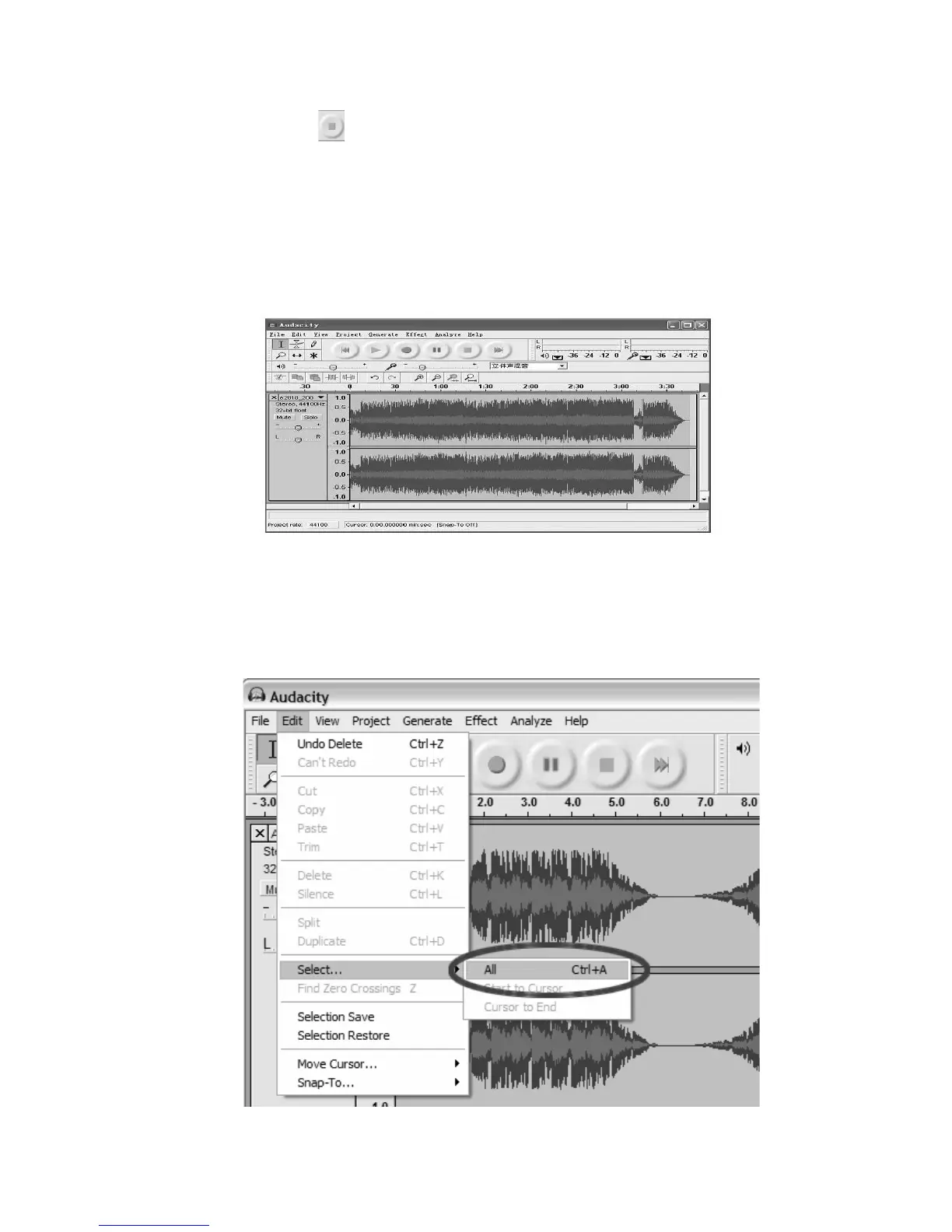 Sélectionnez tout votre enregistrement en choisissant « Edit » (Modifier), puis « Select… »