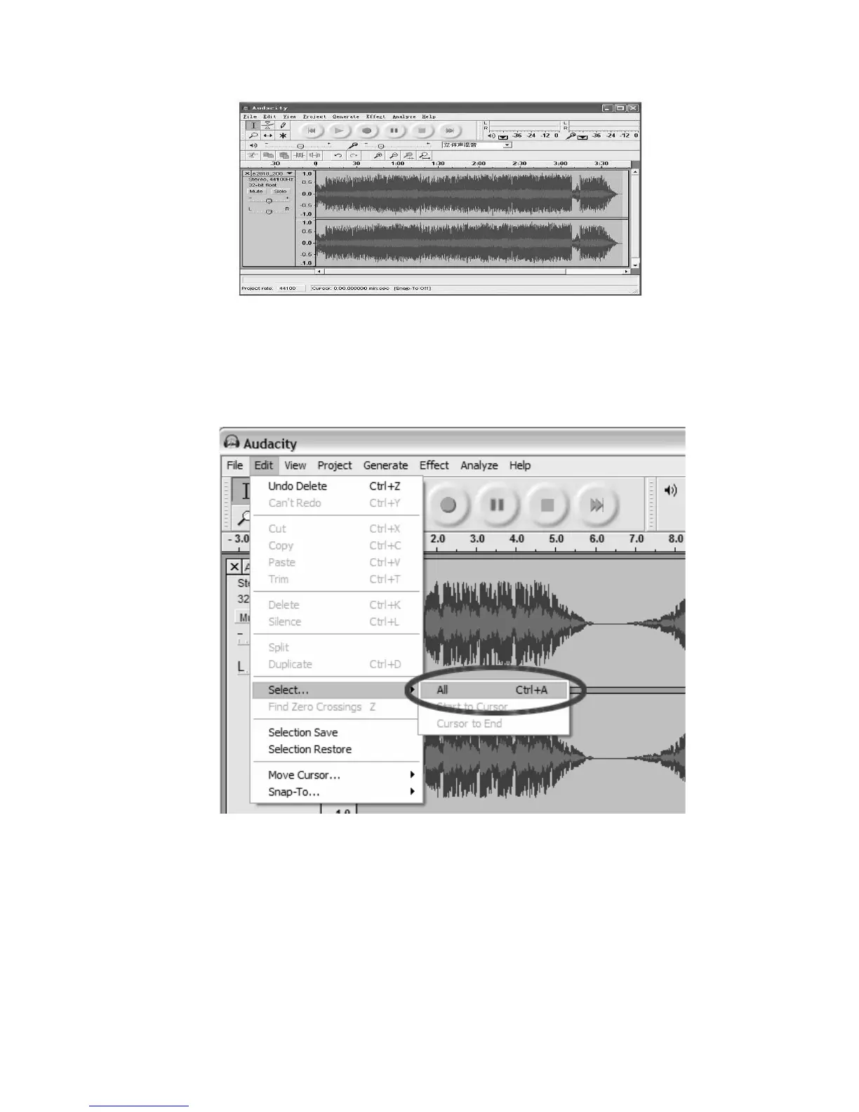 Seleccione toda la grabación seleccionando “Edit,” (Editar,) posteriormente, “Select…”