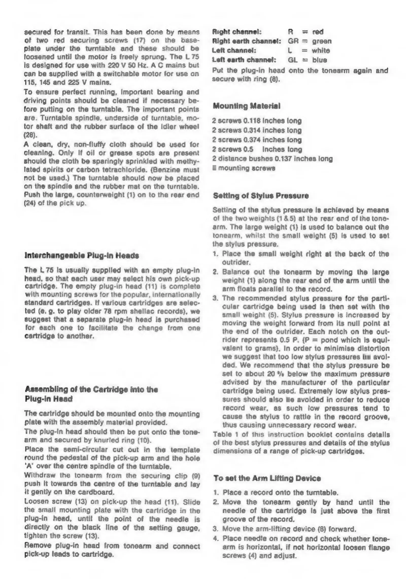 LENCO L 75 - Cartridge Installation and Setup; Interchangeable Plug-In Heads; Assembling Cartridge in Headshell; Setting Stylus Pressure