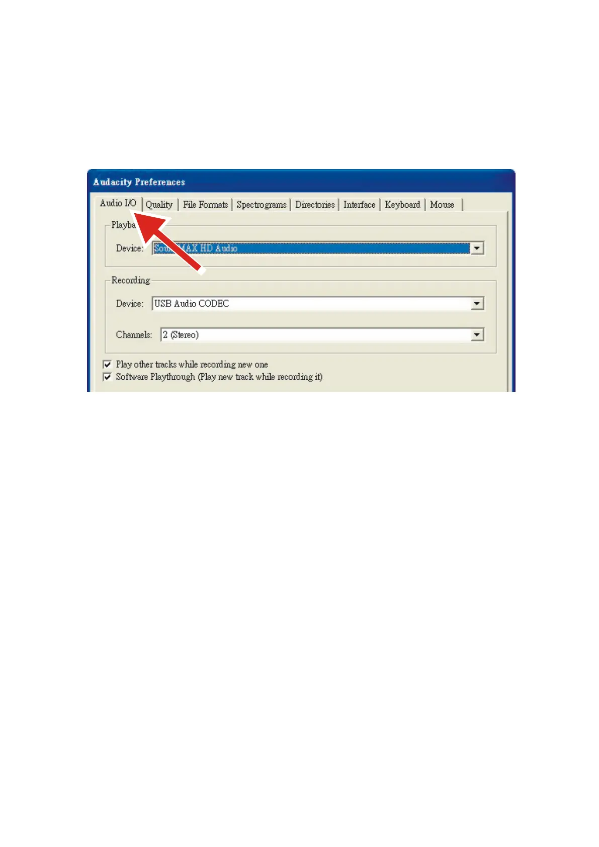 6. Klicken Sie oben links auf den Reiter Audio I/O (Audioschnittstelle).