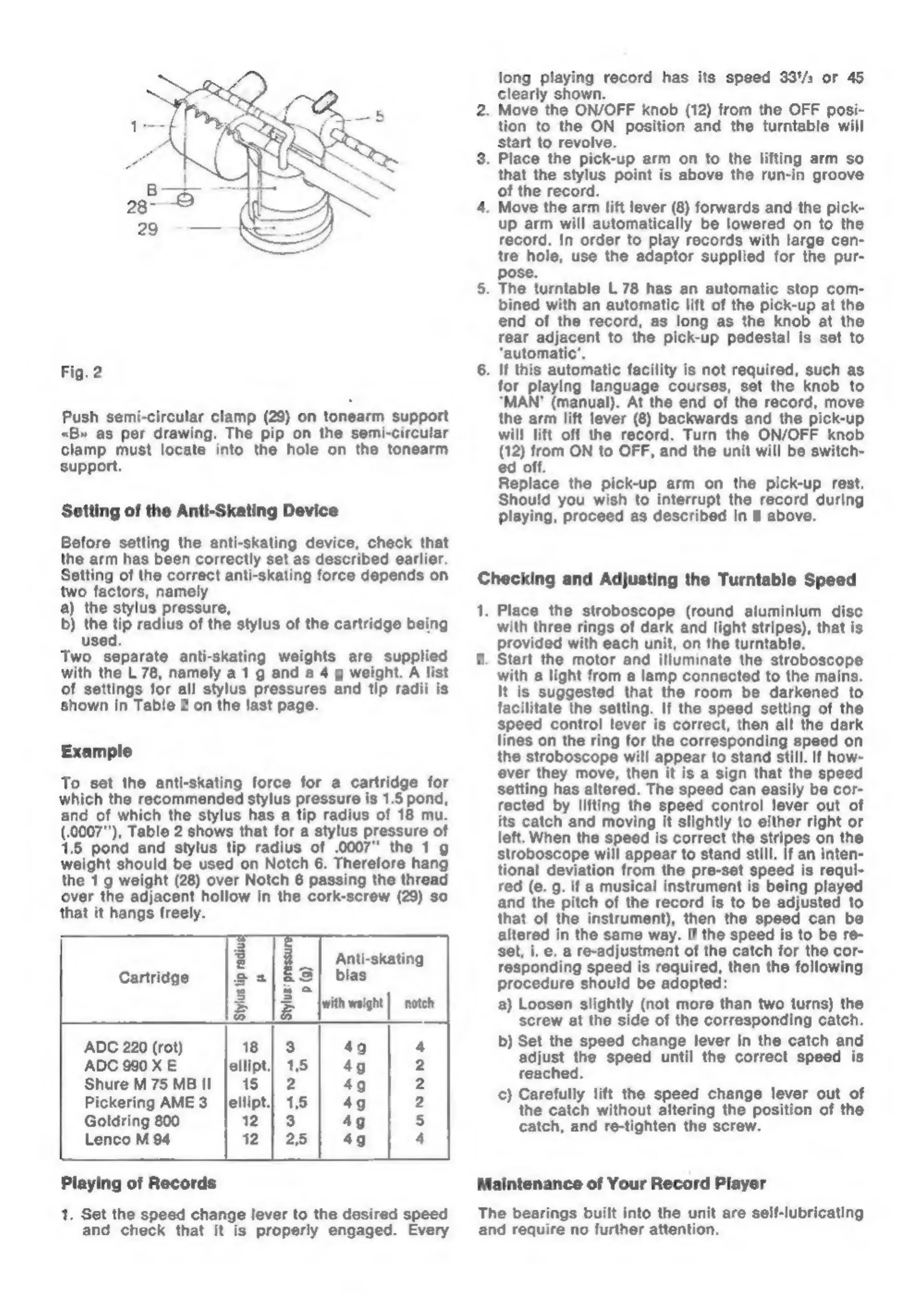 LENCO L78 - Setting of the Anti-Skating Device; Playing of Records; Checking and Adjusting the Turntable Speed