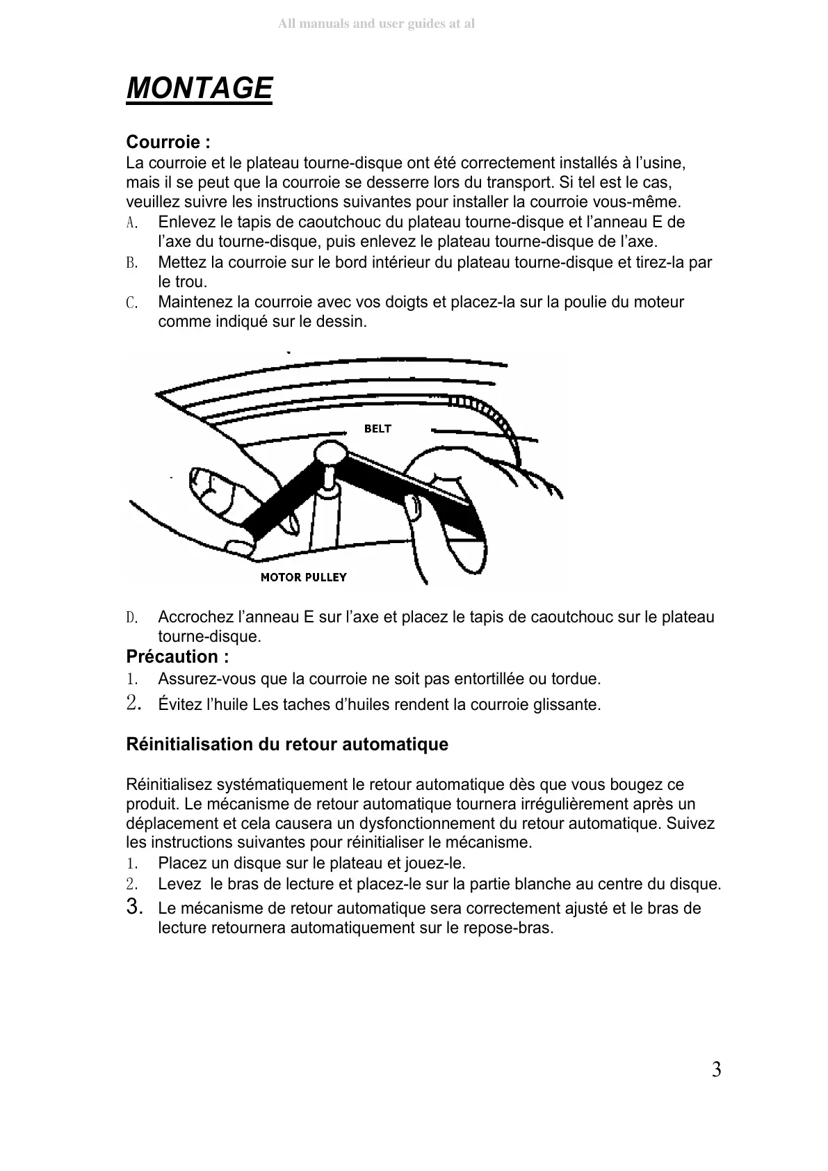 La courroie et le plateau tourne-disque ont été correctement installés à l’usine,