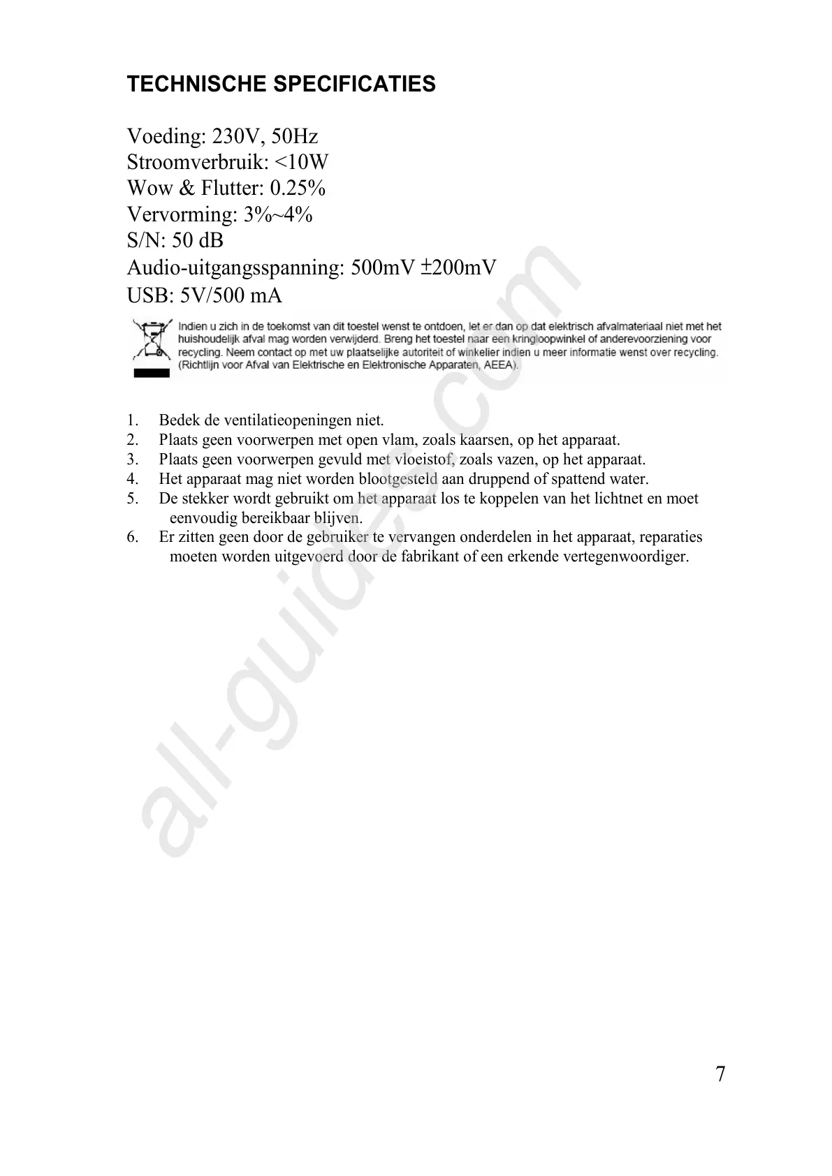 6. Er zitten geen door de gebruiker te vervangen onderdelen in het apparaat, reparaties