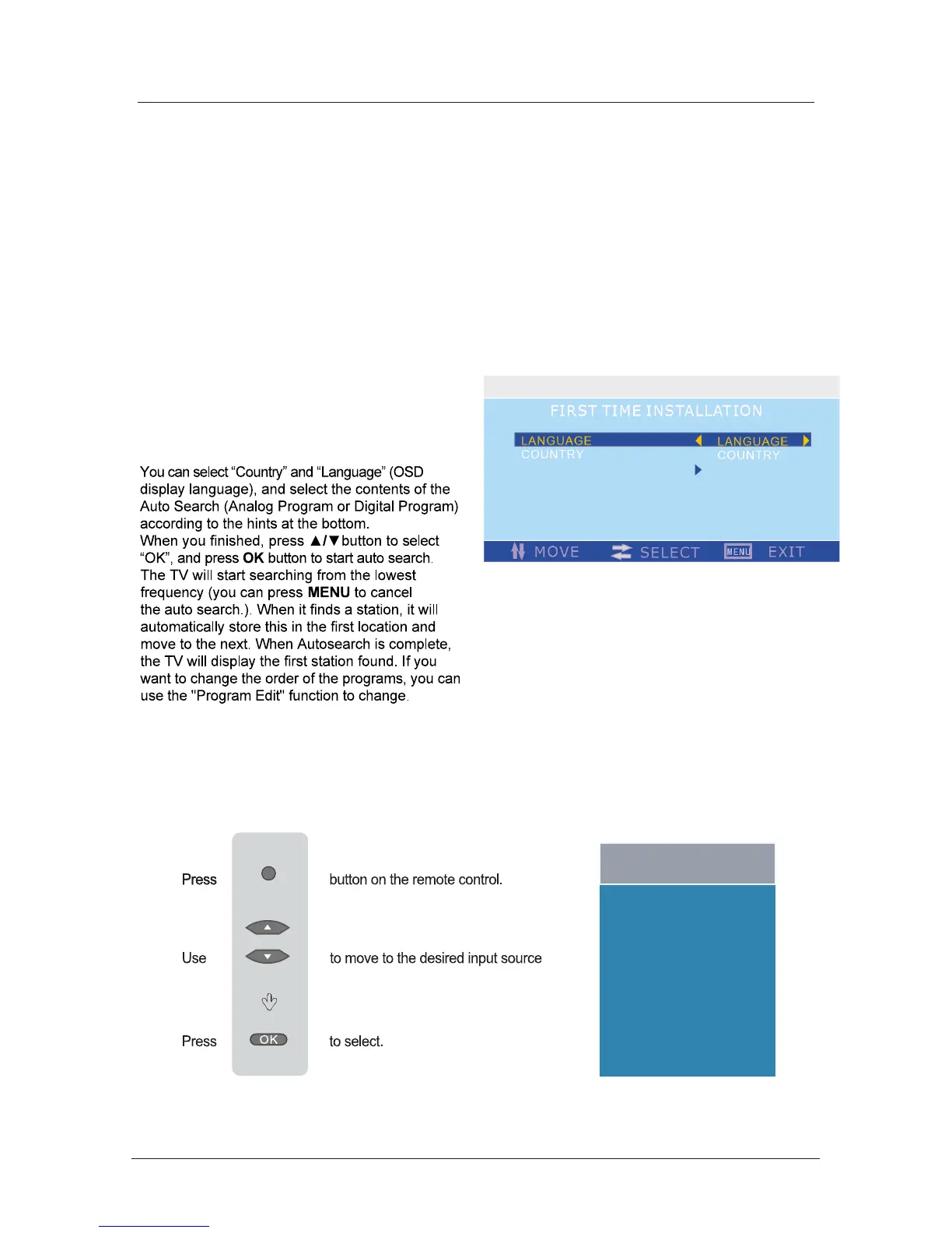 When you initially turn on the LCD TV you will see the first time installation menu as below: