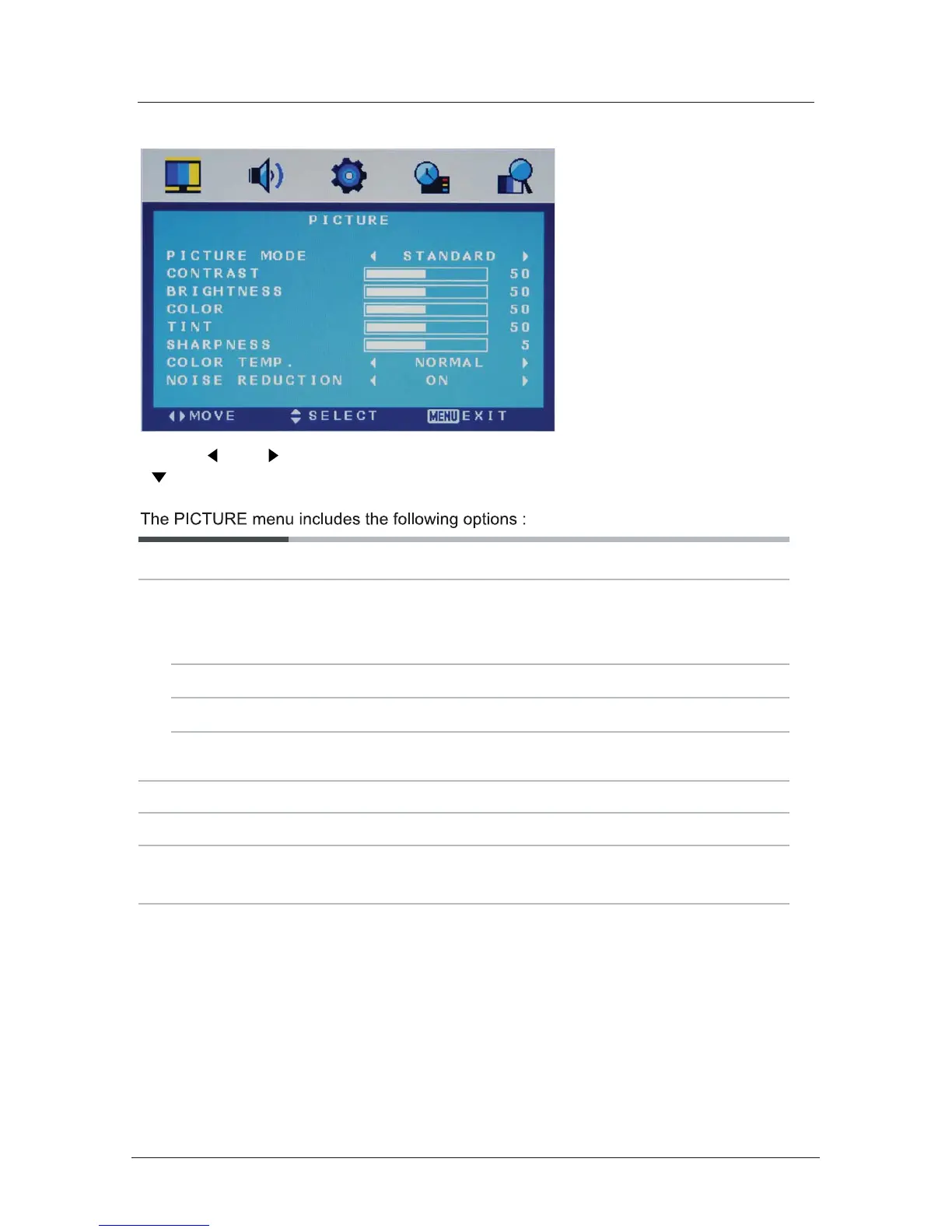 Use the and buttons to select the PICTURE menu (as the picture above), press