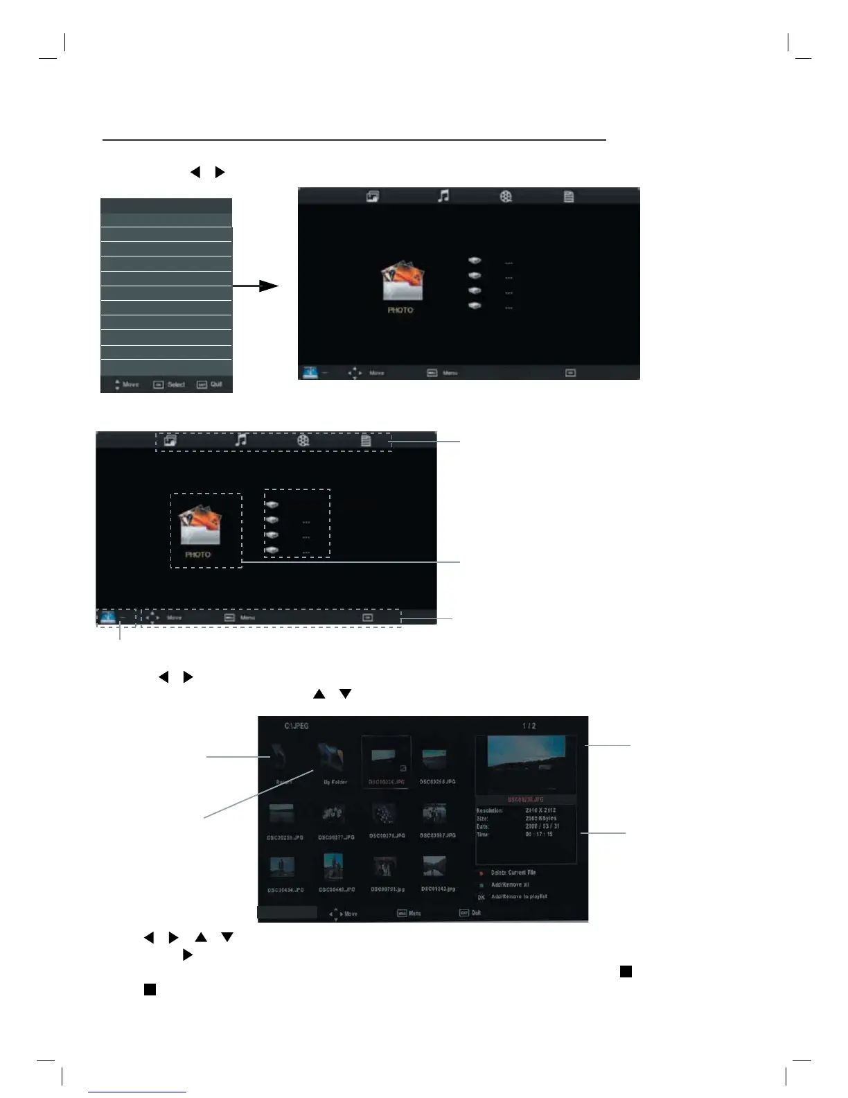 MUSIC, MOVIE and TEXT. Press / button to select the device and press OK button to enter.